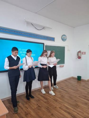 28.10.2024г к началу предметной недели истории Бектемисовой Г.С было проведено внеклассное мероприятие в 6 Б классе посвящённое Дню Рождения нашей Республики Казахстан.Мероприятие началось с исполнения гимна РК и просмотра видеоролика о нашей Родине.Далее учащиеся 11 Б кл подготовили стихи о нашей родине и ученики 6 Б класса прислушались к словам поэтов: «Казахстан» Ж. Жабаева,«О степь моя». С. Мауленова,«Родина моя.» Н. Поляковой,«Моя Республика» Т. Айбергенова. Затем учащиеся поработали с картой РК и отгадывали города и области по прочитанному тексту.Следующим заданием ребятам предлагалось рассказать о Родине на государственном языке и написать синквейн . Урок прошел интересно и познавательно,все учащиеся были вовлечены в процесс работы.
