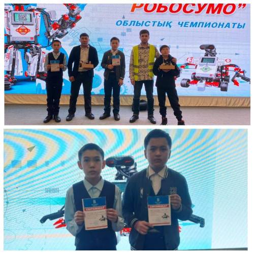 08.02.2023 учащиеся нашей школы Абылкасымов Айып и Сабыр Мирас приняли участие в областном чемпионате" LEGO MINDSTORM EV3 РОБОСУММА "в категории" Сумо 25х25 , 1 кг " и были награждены сертификатами..
