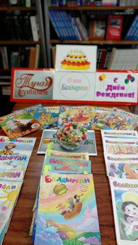 Сегодня наша библиотека украшена шарами, у маленьких читателей на голове красочные колпачки а на столе вазочка с угощениями. И все это потому, что в библиотеке празднуется день рождения. Сегодня свой 65- летний юбилей отмечает детский журнал "Балдырған", завоевавший признание и любовь у разного поколения читателей. В течение дня библиотеку посетили более 30 читателей , которые узнали когда вышел первый номер журнала и кто из писателей принимал участие в работе над журналом в разные годы. Сегодня ребята с особым интересом читали вслух маленькие рассказы, играли в настольные игры из журнала, раскрашивали раскраски, с азартом отгадывали загадки и конечно угощались сладостями. Всех желающих познакомиться с очередным детским журналом - добро пожаловать в библиотеку. Вас ждут новые приключения!